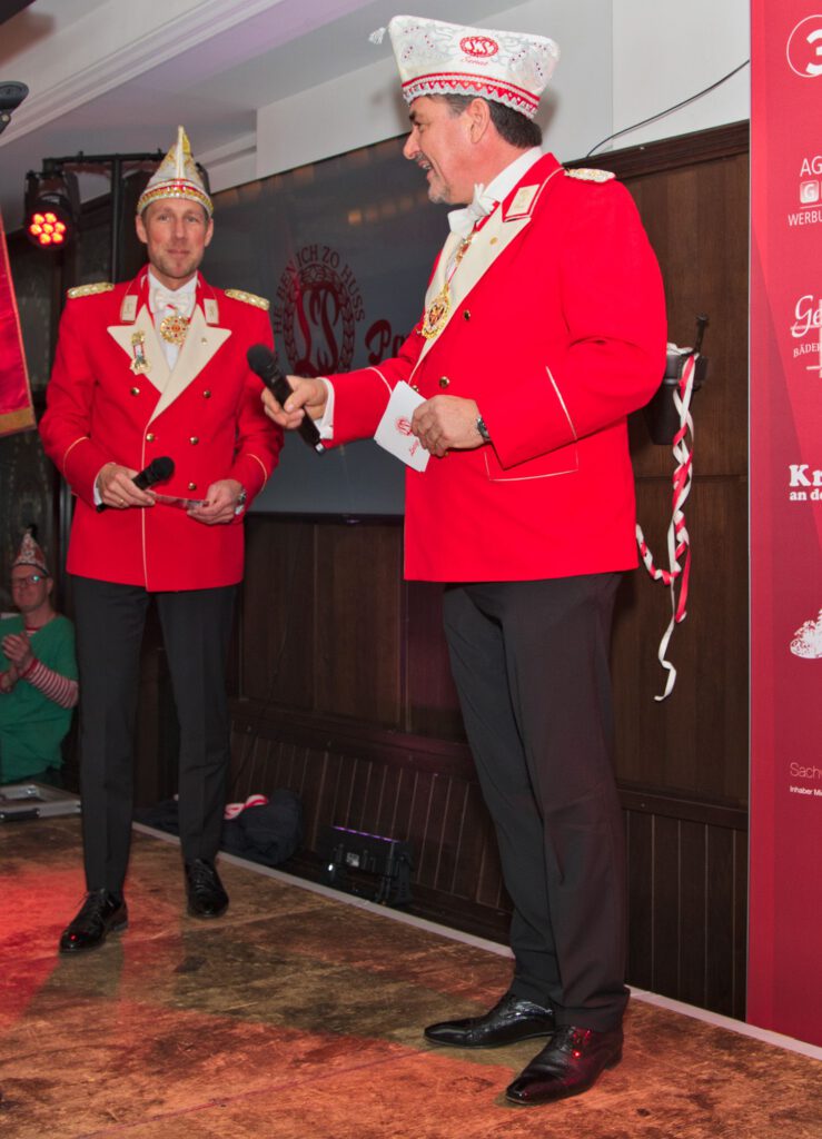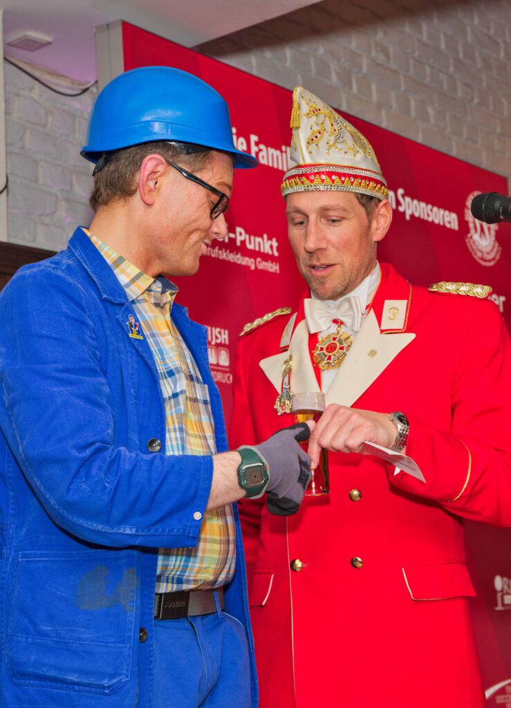 Zuallerletzt überraschte der Elferrat Björn Griesemann mit einer großen Champagnerflasche und Elferratsmitglied Bruno Haumann fand die richtigen Worte des Dankes für den Präsidenten.