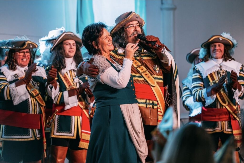 Horst-Peter und Melanie Becker erfüllten sich damit einen persönlichen Traum und präsentierten eine eigens umgedichtete Schlager-Version des Hits „Warum hast du nicht nein gesagt“ von Roland Kaiser & Maite Kelly – dessen Text sie liebevoll auf die Jan un Griet-Geschichte adaptierten. Mit Zeilen wie: „Warum hast du nicht ja gesagt? … Im Schein vom Kümpchenshof …“ sorgten sie für die Überraschung des Abends, Lachen und sogar die ein oder andere Freudenträne im Saal. Auch Festkomitee-Präsident Kuckelkorn zeigte sich tief bewegt: Bei der Verleihung einer Ehrung an ihn selbst – zum Generalwachtmeister des Reiter-Korps – kämpfte er mit sichtbarer Rührung, als Präsident Stefan Kühnapfel seine Verdienste würdigte.