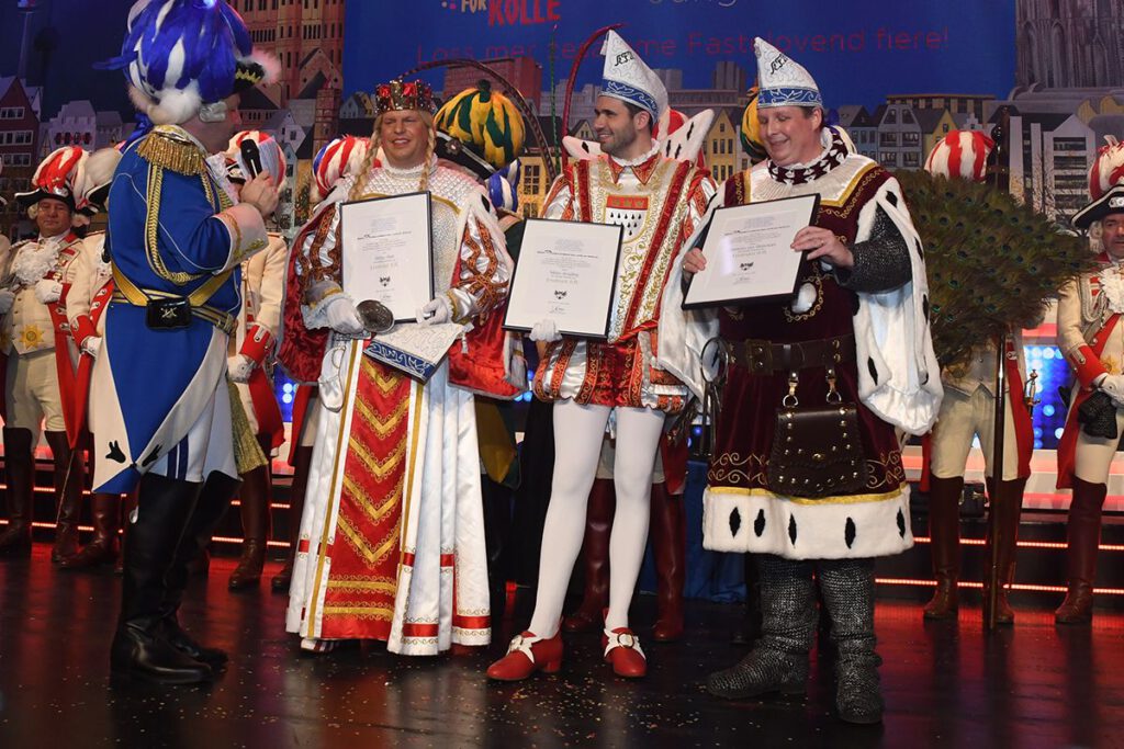 Die zweite Premiere der Sitzung: Das Kölner Dreigestirn 2026 In der Mitte der zweiten Abteilung konnte Präsident und Kommandant Björn Griesemann zum ersten Mal in der Session das Kölner Dreigestirn bei einer Sitzung der Blauen Funken begrüßen. Prinz Niklas I., Bauer Clemens und Jungfrau Annae überzeugten dabei mit ihrem lockeren und fröhlichen Auftritt die Gäste der Blauen Funken. Als Auszeichnung für ihre Leistung und ihren Einsatz für den Kölner Karneval ernannte die Kölner Funken Artillerie blau weiß von 1870 e.V. Prinz Niklas I., Bauer Clemens und Jungfrau Annae zum Leutnant der Reserve.