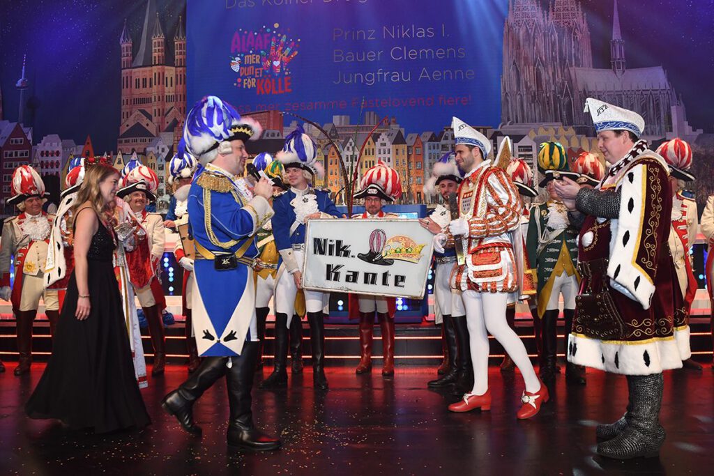 Ein sehr persönliches Geschenk erhielt danach Prinz Niklas I. aus den Händen von Blaue Funken Präsident und Kommandant Björn Griesemann und seiner Frau Antje: das Werbeschild des Karnevalsausstatters “Nik. Kante“, der über Jahrzehnte auch das Kölner Dreigestirn “eingekleidet“ hatte. Die beiden hatten dies vor drei Jahren erstanden und so lange aufbewahrt, bis Niklas Jüngling seinen Kindheitstraum erfüllen konnte.