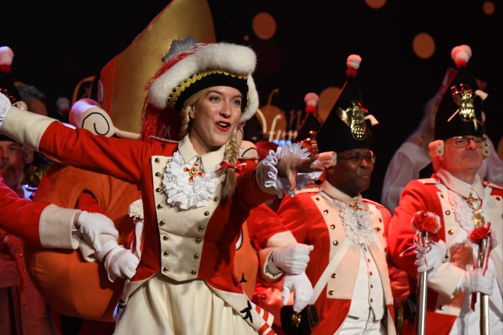 “ Mer kumme mit alle Mann vorbei“ hieß es beim Auftritt der Roten Funken. Orden, Bützchen und Blumen gab es für die Marie nach dem umjubelten Auftritt. “ Upgesycelt“ hatte sich Achnes Kasulke mit viel Bling Bling.
