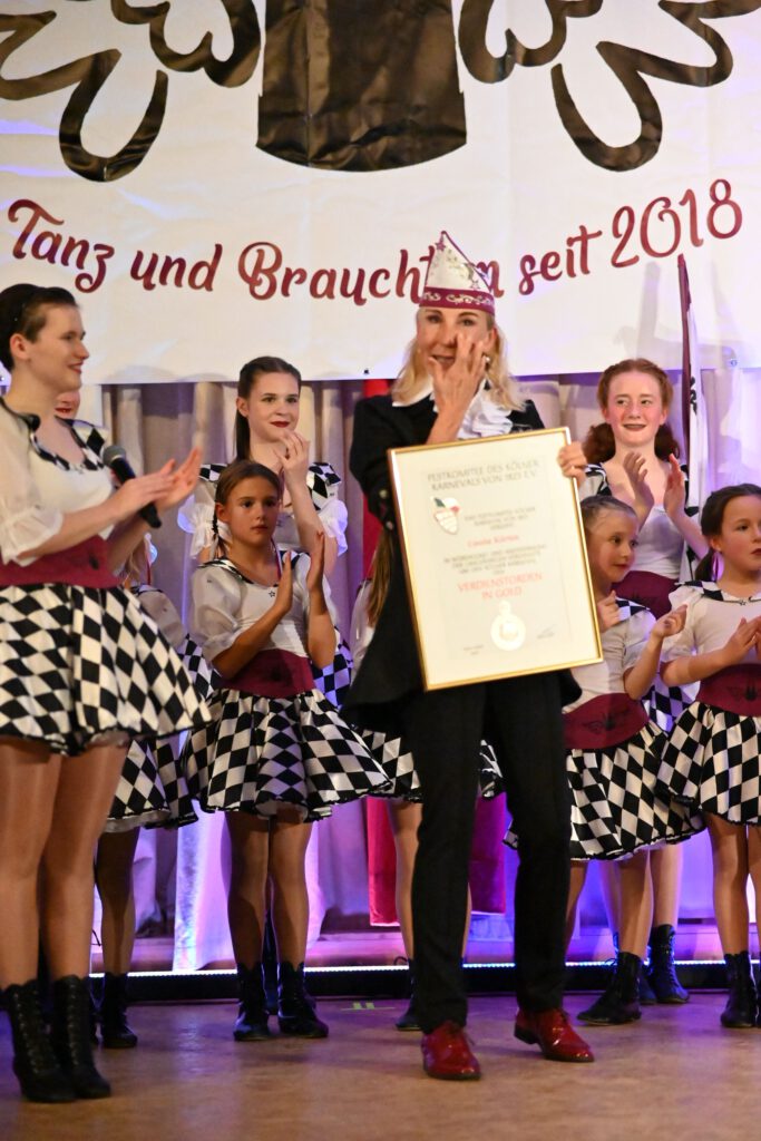 Wenn das Festkomitee vertreten durch Udo Marx, Schatzmeister und zuständig für den Mitgliederservice im Türrahmen steht ist eine Ehrung nicht weit. Und soerhielt die völlig verdutzte Cassia Kürten den Verdienstorden in Gold an diesem Abend!